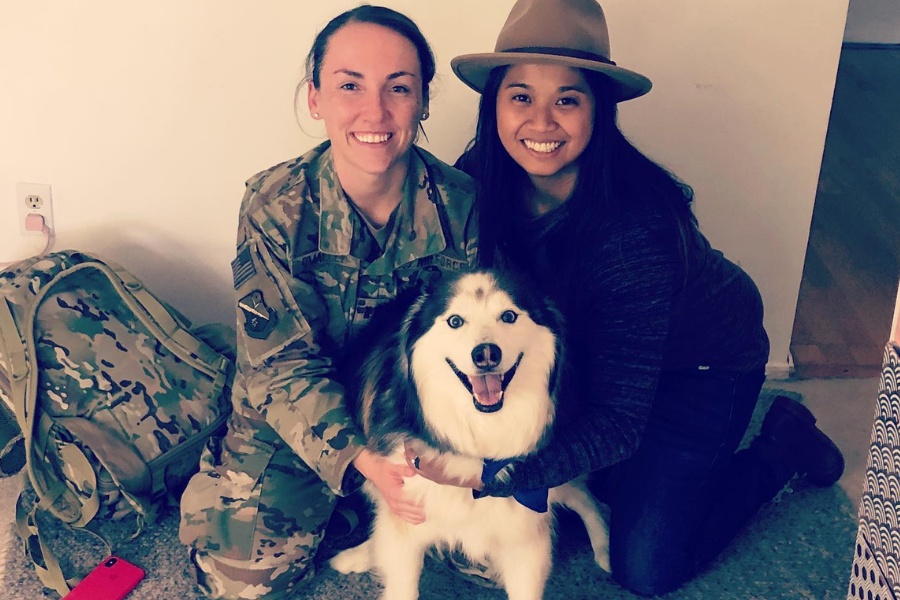 Caption: Coming home from deployment with my wife, Jerice, and our dog, Ryder.